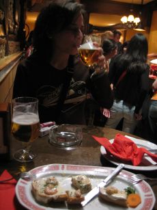Não chegamos a entrar em um bar de pinchos, que não petiscos variados servidos no palito, mas o Alê já fez um toast do assunto de Barcelona. Provamos as tostas. São tapas de pão torrado cobertas com ingredientes variados. No La Tosta comemos uma de gambas con alioli (molho branco de alho com camarões). De chorar.
