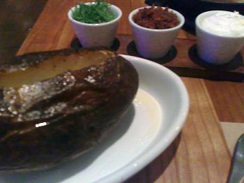 Já na mesa, perguntei ao garçom qual era a sugestão do chef. Ele me disse que era um corte de Kobe Beef na versão criada nos EUA, que é bem mais barata. Pedi o corte (era caro, 70 dólares – contra 180 do “bife” original importado do Japão) acompanhado de baked potato e uma taça de vinho tinto.