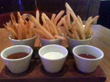 Antes da carne chegar, adorei as entradas. Primeiro, uma focaccia de batata com sal grosso e alecrim, depois um “trio de batatas fritas” com temperos e molhos distintos – uma com páprica e molho agridoce (parecia apimentado com ketchup), outra com alho e molho de trufas (a melhor de todas) e a última temperada com algo não identificado e molho barbecue (mais ketchup na veia).