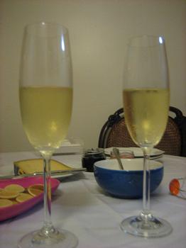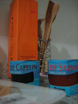 Entrei com o champagne e a Cecília com o caviar. No Empório Santa Maria, ela comprou ovas ‘tipo caviar’ de capelin (peixe da Islândia) e de salmão, por cerca de R$ 20 cada vidro (deu muito bem para três e sobrou).