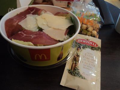 Durante o dia nos esbaldamos no McDonald’s italiano, que é muito mais criativo do que o nosso. Nas entradas, por exemplo, eles oferecem o gamberi (três camarões médios empanados) por 3 euros. Entre os sandubas especiais, destaque para o CBO (Chicken, Bacon and Onion), com pedacinhos de onion rings e pão salpicado de bacon, e o Matrimônio (cheese salada com pedacinhos de presunto parma no pão ciabata macio). Até a salada era bacana: rúcula, alface, lascas de parmesão e presunto parma com molho de azeite e limão. Recomendo.