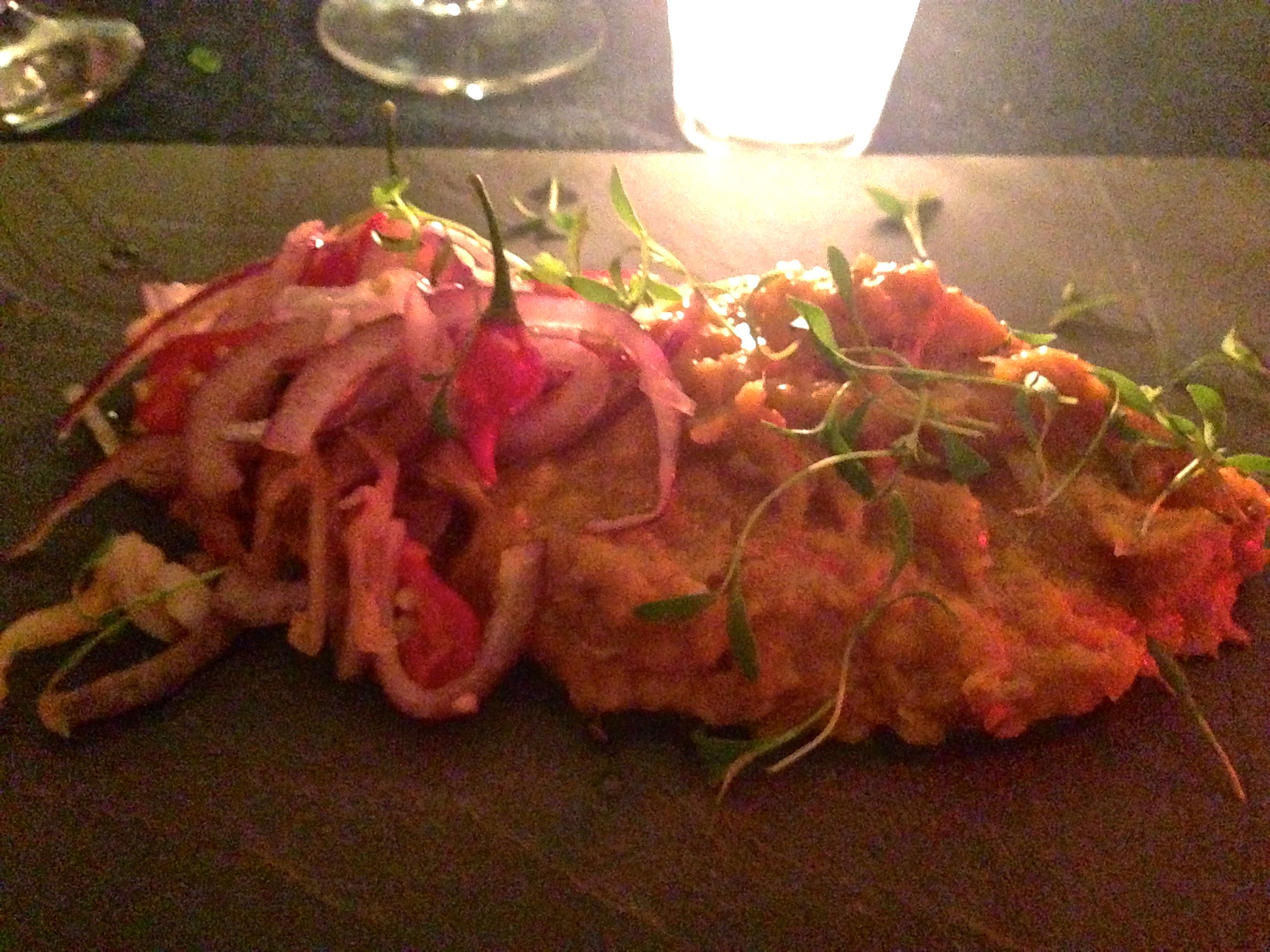 Da memória de infância, em Santos, e do cuscus paulista da esposa, Gustavo tirou um casamento de casquinha de siri e cuscus cremoso com brotinhos de coentro e vinagrete de cebola roxa com pimenta biquinho. Era pra comer de colher, literalmente. O ácido e crocante da cebola mesclado à suavidade do siri no cremoso cuscus-casquinha, com brotinhos delicados por cima eram tudo de bom. Equilibrado, reconfortante e perfeito com a explosão de sabores da Wayan.