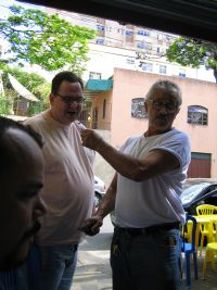 Até comida na boca, o Dias fez questão de dar a cada na hora de cortar as carnes, que tinham acabado de sair da grelha. Recomendo a maçã de peito e a costela de boi acebolada com madioca cozida e manteiga de garrafa. Cada um com seu garfo atacou as tábuas e fez a festa. Tudo acompanhado, é claro, de cervejas ultra geladas no padrão de BH.