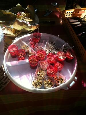 Lá fui eu me meter na cozinha com a minha irmã, Fabi, muito interessada na receita que você encontra logo abaixo. Para o evento, fiz uma apresentação em copinhos descartáveis de plástico com três versões de cobertura, para fazer um laboratório: bolinhas crocantes de chocolate, farofas de castanha de caju e de pistache.