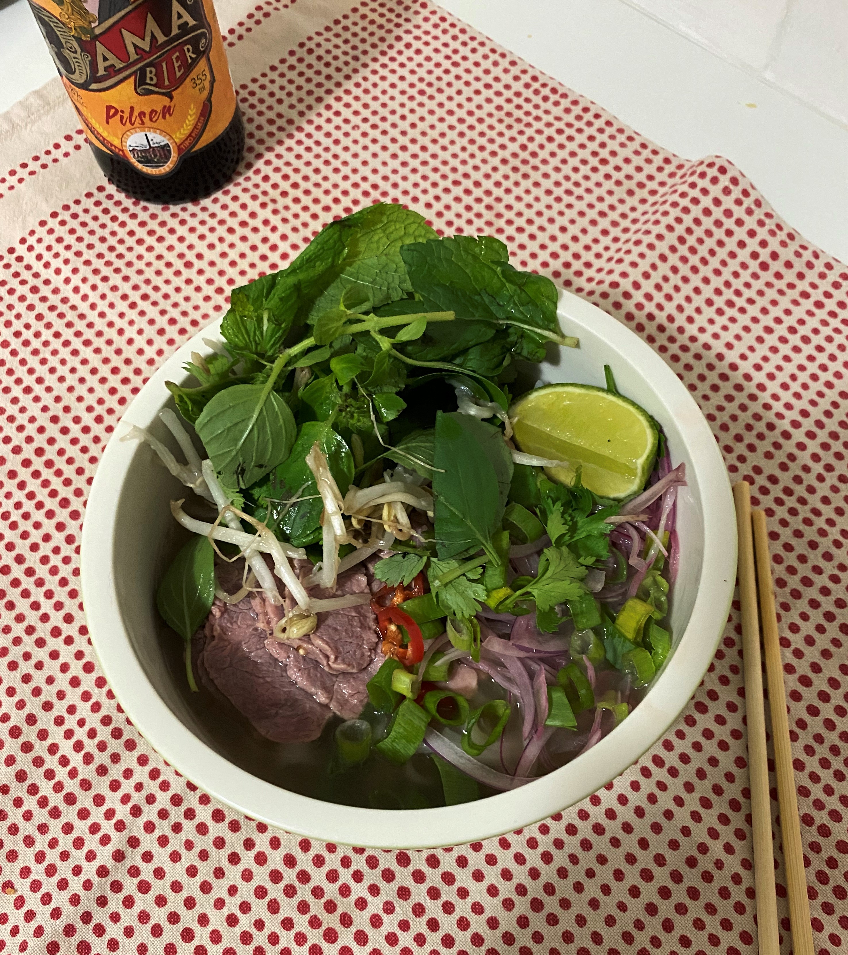 Aí você monta numa tigela/bowl o macarrão de arroz, as fatias de alcatra bem fininhas, cebolinha e a pimenta. Depois despeja o caldo quente com cuidado, dá uma mexida de leve pra soltar o macarrão e cozinhar a carne. Finalize com as folhas de hortelã, manjericão e o broto de feijão por cima (todos embrulhados a parte), esprema o limão e abraça a felicidade. O pho é quente, refrescante e traz muito sabor.