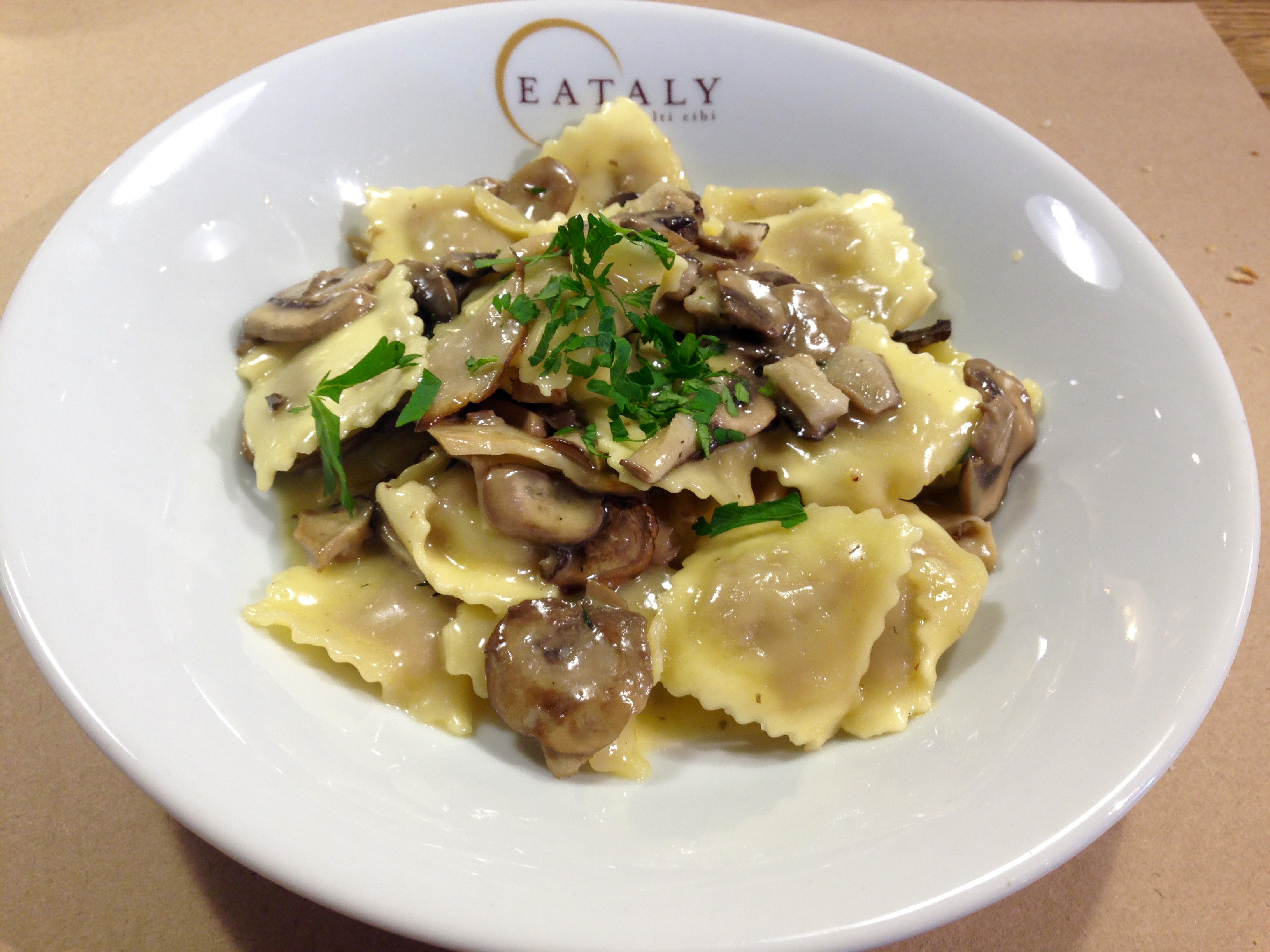 Ravioli de carne com molho de cogumelos é uma das opções de almoço rápido do Eataly. Menu de R$ 45, com suco e sobremesa, muda semanalmente.