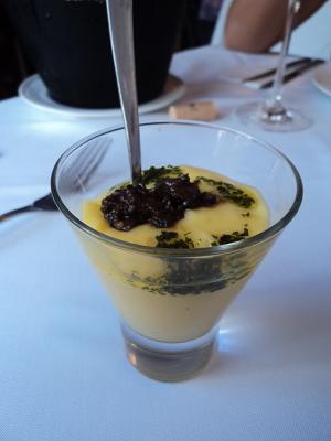Cheguei já de olho na cozinha e percebi que o chef Markus finalizava, com o maçarico, uma série de potinhos de louça com um creme claro. Sobremesa adiantada? Não, entrada: um saboroso creme brulée de foie gras.