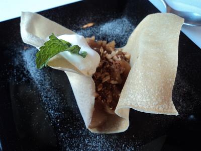 Compota de maçã com canela, servida em uma fina massa crocante, com toque de chantily e folha de hortelã