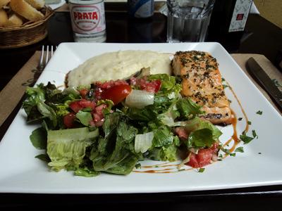 Comecei com uma delicada tartine de salmão defumado, dill e suave creme azedo. Ciça elogiou o bouquet de maçã verde, salsão, nozes e queijo de cabra fresco. A chegada, até rápida demais, dos pratos principais não a impediu de saborear sua saladinha até o fim.