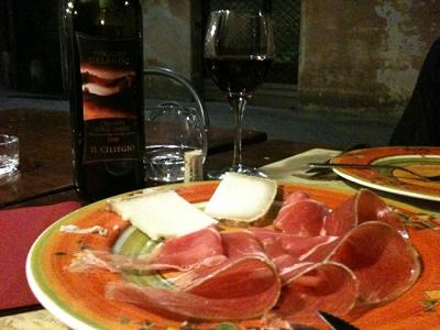 A porção de presunto cru, macio e saboroso, e pecorino da região estava divina. O pão italiano muito macio também nos surpreendeu (bem melhor do que o pão duro de Roma). Já o Chianti que pedimos (10 euros a garrafa) podia ser mais fresco. Estava calor e serviram o vinho na temperatura ambiente. Tristeza.