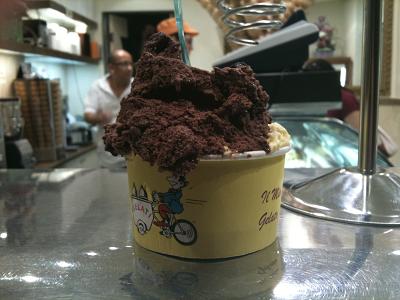 Entre um passeio e outro, um gelatto sempre vai bem. A vitrine da gelateria Brivido é uma tentação. Desta vez, o sorvete de chocolate foi acompanhado do sabor creme inglês. Muito bom.