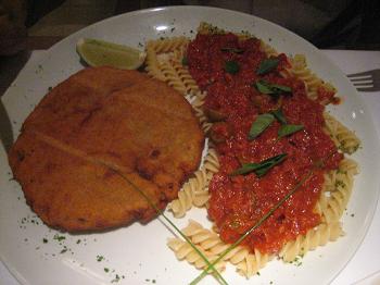 Na noite de sábado em que estive no Giacomo para jantar com o Dexter, o pessoal estava inspirado. Nosso garçom favorito, que se parece com o John Malkovich – exceto pelos olhos azuis -, estava lá sempre simpático como toda a equipe. Acho que o salão tinha cinco mesas em atendimento. E mais ou menos dez minutos após o pedido, lá estavam os pratos de truta com amêndoas e risoto de rúcula com tomates e filé a milanesa com fuzili (lá o fuzili é o ‘parafuso’) ao molho de calabresa. E tudo estava ótimo. Detalhe: os preços também são corretos (pratos individuais muito bem servidos de R$ 21 a R$ 34).