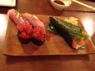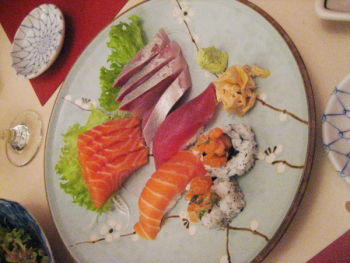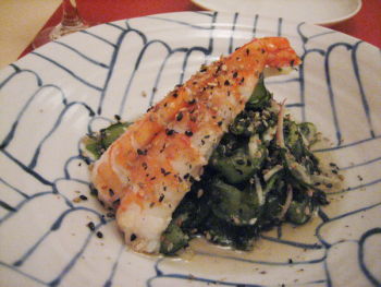 A parte boa de um japonês que não tem rodízio é estudar o cardápio em busca de sabores diferentes. Começamos com um Sunomono, saladinha de algas, frutos do mar e pepino com molho agridoce (R$ 9,50). Boa entrada, embora não tenha atendido a expectativa. Exceto pelo camarão no topo e pelo kani desfiado, os frutos do mar não estavam lá.