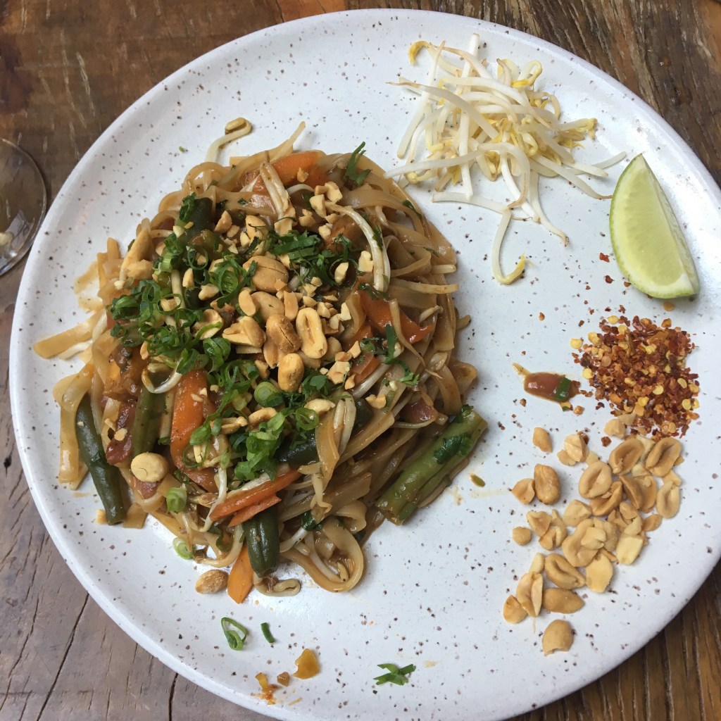Ainda na pegada asiática, recomendo o Pad Thai (R$ 46) um clássico tailandês que leva tofu empanado no lugar das carnes, macarrão de arroz, legumes, broto de feijão, amendoim e molho de tamarindo que traz aquele agridoce característico do prato e ficou fantástico. A carne não fez falta, sinceramente.