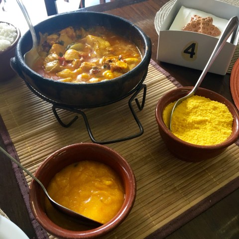 A moqueca da vez foi a de abadejo com polvo (meia moqueca sai por R$ 88 e serve duas pessoas) que chega à mesa borbulhando na panela de barro, acompanhada de arroz branco, pirão e farofa de dendê. Polvo macio, peixe no ponto e o tempero envolvente como sempre. Como é bom matar saudade desse prato.
