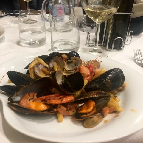 Os “fritos” do mar de entrada são um clássico da área e abriram muito bem o apetite com o vinho branco da casa para os principais: fusilli pescatora com muitos frutos do mar e ravioli de ricota ao molho de tomatinhos, camarão e rúcula.