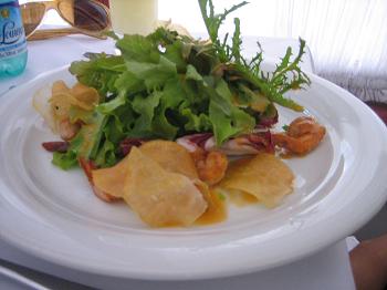 Ou Salada de lulas e camarões à provençal com tapenade de azeitonas pretas e torradas