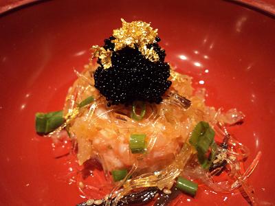 Salmão cru bem picadinho com pedaços de água-viva, temperado com azeite, limão e sal, decorado com filetes transparentes de alga (imitando barbatana de tubarão), ovas de peixe voador e folhas de ouro. A deliciosa arte retratada acima foi um presente de Shundi Kobayashi, um dos sushimen mais experientes e respeitados do mercado, que atua no tradicional Miyabi há pouco mais de um mês.