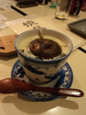 Entre os pedidos da mesa estava uma interessante cumbuca de arroz japonês coberta de carne de frango moída e um ovo cru, que deve ser misturado na comida. Provei um pouquinho do lamen com carne fatiada e caldo bem suave. Destaque para o chawan mushi – espécie de pudim quente de ovos e cogumelos cozidos ao vapor – muito bem temperado, quentinho e reconfortante.