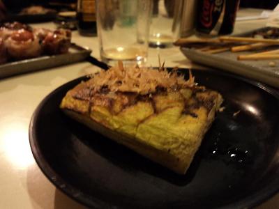 Para finalizar, uma surpresa gostosa: berinjela grelhada com raspas de peixe, que dançam ao calor da comida. Acredito que o chef, como um bom observador, fez uma referência a um comentário que fiz sobre o Okonomiyaki, a ‘pizza japonesa’ salpicada de raspas de peixe servida no Izakaya Issa.
