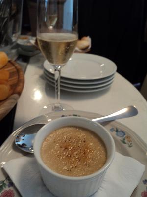 Cheguei já de olho na cozinha e percebi que o chef Markus finalizava, com o maçarico, uma série de potinhos de louça com um creme claro. Sobremesa adiantada? Não, entrada: um saboroso creme brulée de foie gras.