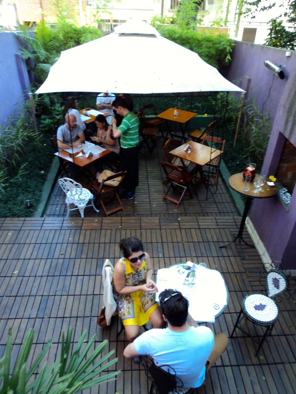 Descendo uma escada e subindo outra fomos levados a um espaço tranquilo e arborizado, nos fundos, que também tem uma parte com cobertura para os dias de garoa. O cardápio, de entradas, tapas e principais está descrito em uma única lousa que a jovem Natália – sobrinha de Edson, nascida no Brasil e criada em Astúrias – leva aos clientes.